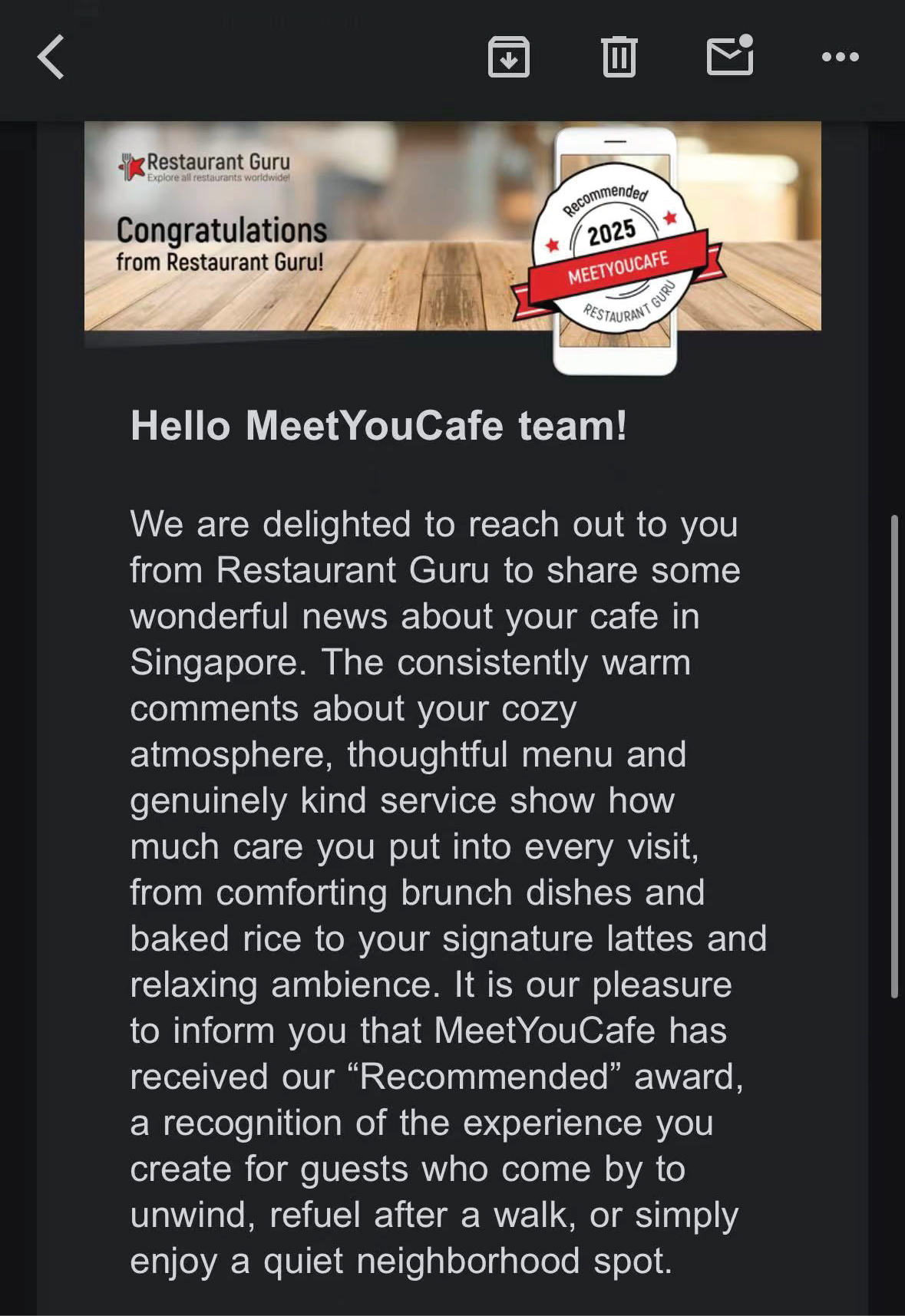 Joey Lin2024-09-14Meet You Cafe is a cozy and chill cafe located within the the newly built Normanton Park. They serve brunch items but coffee lovers would be pleased to know that they offer Tiong Hoe coffee! Tried the I Love NY ($18.90) which is a brunch perfect combination of scrambled eggs with onions, cherry tomatoes, and toasted sesame bagel with cream cheese. 😍 The scrambled eggs were well executed and it was creamy and silky, exactly how I prefer it to be! The sesame bagel was nice and warm and man it went so well with the cream cheese spread. Overall a hearty meal to power up the day. I do feel that prices are on the higher side for simple cafe food and its slightly ulu location but folks staying at Normanton condominium are in for a treat! 👉🏻 Follow me on instagram @littlemissramensg for more food reviews!